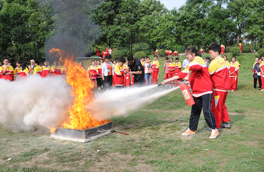 在滅火演練現場,我校保衛處工作人員向附中師生說明和示范了遇到火災后的處理方法和滅火器的使用方法,并指導師生進行了滅火演練。