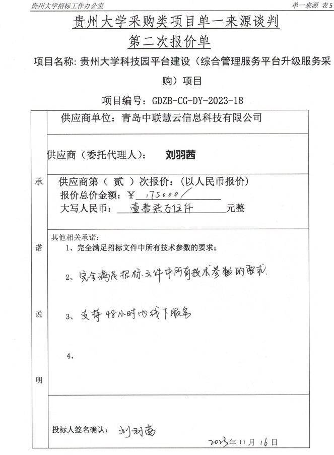 1 | 青島中聯慧云信息科技有限公司 | 青島市李滄區九水東路130號亞馬遜聯合創新中心21樓2108 | 貴州大學科技園平臺建設(綜合管理服務平臺升級服務采購)項目,詳見《單一來源采購談判文件》 | ¥175000.00 |