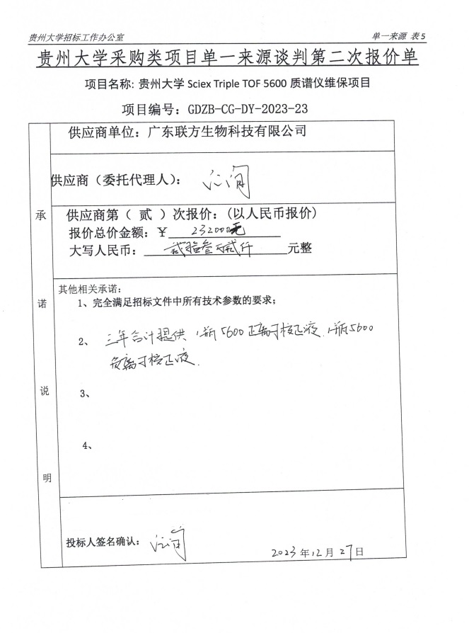 1 | 廣東聯方生物科技有限公司 | 廣州市番禺區南村鎮江南工業二區一橫路1號H棟406、405、404 | 貴州大學Sciex Triple TOF 5600質譜儀維保項目,詳見《單一來源采購談判文件》 | ¥232000.00 |