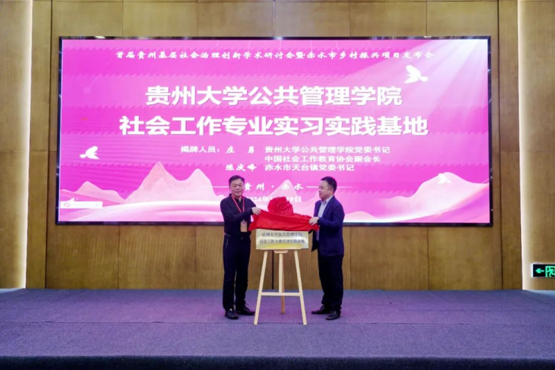 開幕式上,在中國社會科學院原副院長、全國人大社會建設委員會原副主任委員、中國社會科學院學部委員、政法學部主任、中國社會學會學術委員會主任李培林,社會變遷研究會會長、中國社會學會學術委員會副主任、上海大學“偉長學者”特級崗教授李友梅教授,中國社會學會學術委員會副主任、云南大學特聘教授、貴州基層社會治理創新智庫特聘研究員謝壽光,中國社會學會副會長、華東師范大學社會發展學院院長文軍教授等見證下,貴州省人大社會建設委員會主任委員、中國社會學會副會長、貴州基層社會治理創新高端智庫首席專家李建軍和中共貴州省委宣傳部副部長、省電影局局長黃其松為“貴州大學基層治理研究院”揭牌。