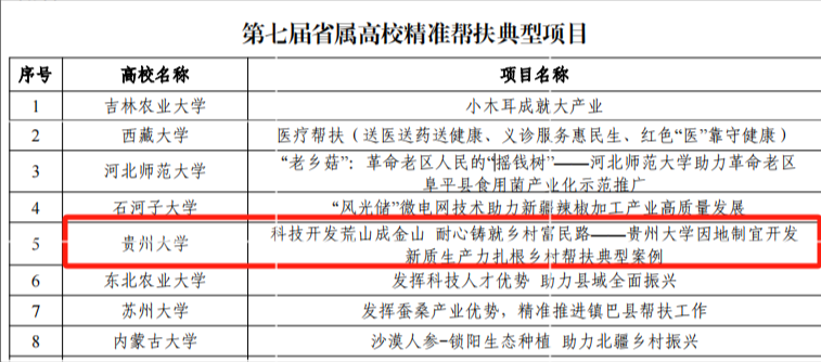 此次推選旨在進(jìn)一步做好鞏固拓展教育脫貧攻堅(jiān)成果同鄉(xiāng)村振興有效銜接,總結(jié)交流推廣高校幫扶工作經(jīng)典模式、成功案例、創(chuàng)新做法。本屆共32個省級教育行政部門和12所部省合建高校推薦項(xiàng)目217個,經(jīng)投票推選,共推選出66所高校的典型項(xiàng)目。至此,貴州大學(xué)已連續(xù)6年獲得教育部省屬高校精準(zhǔn)幫扶典型項(xiàng)目。